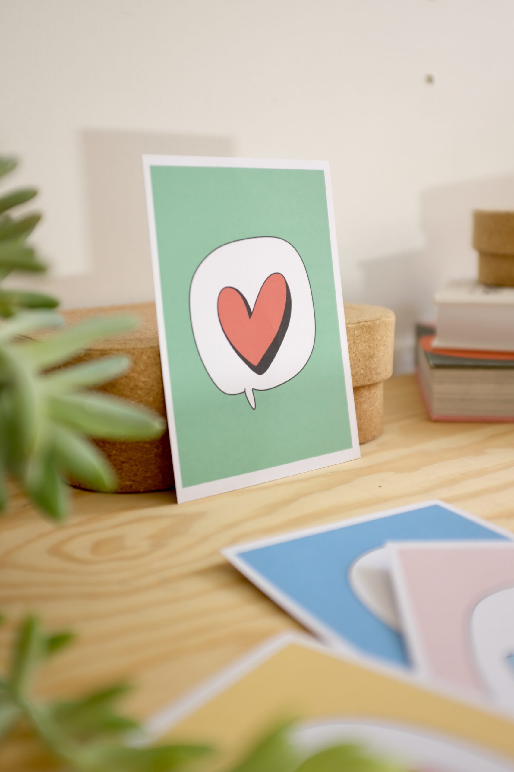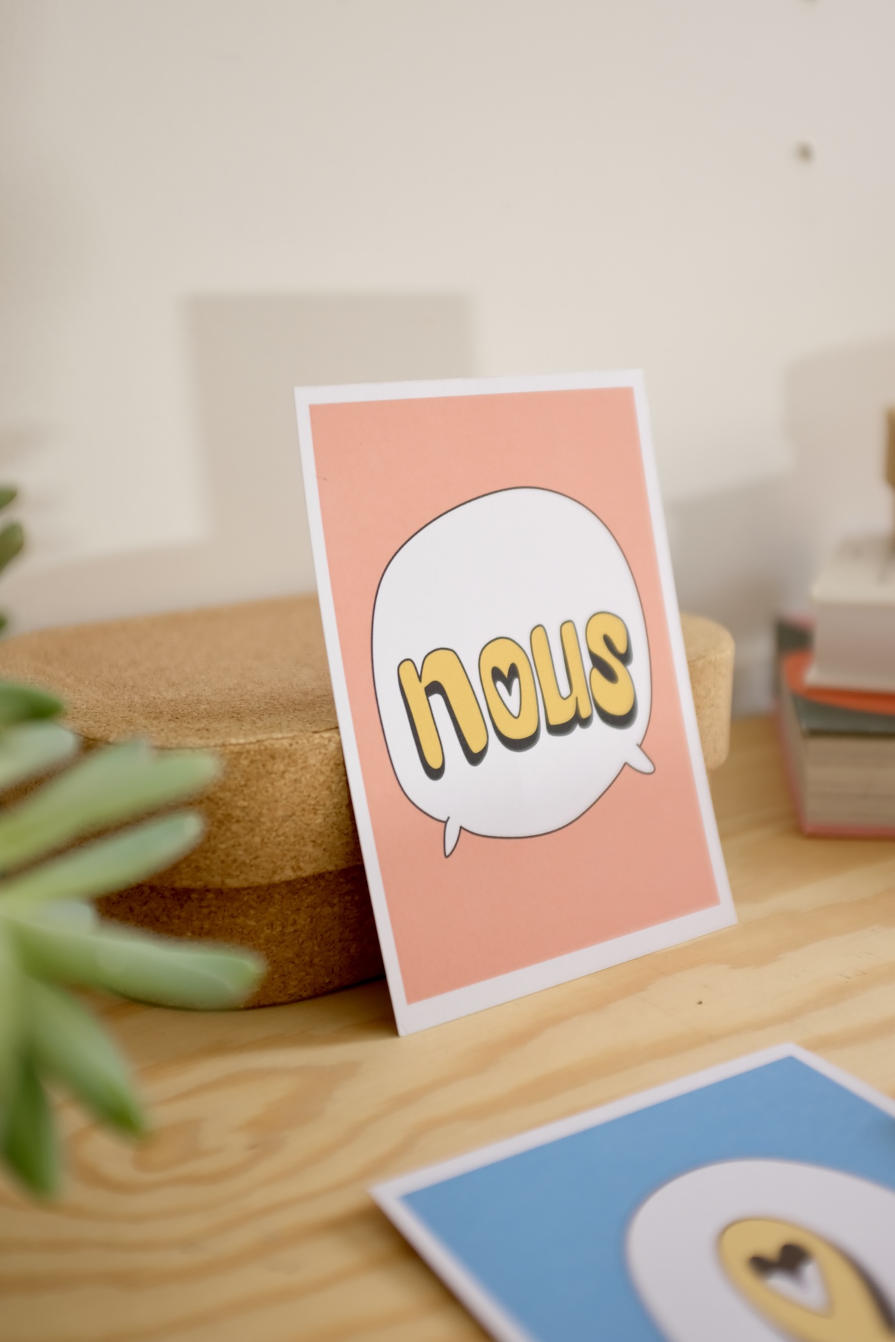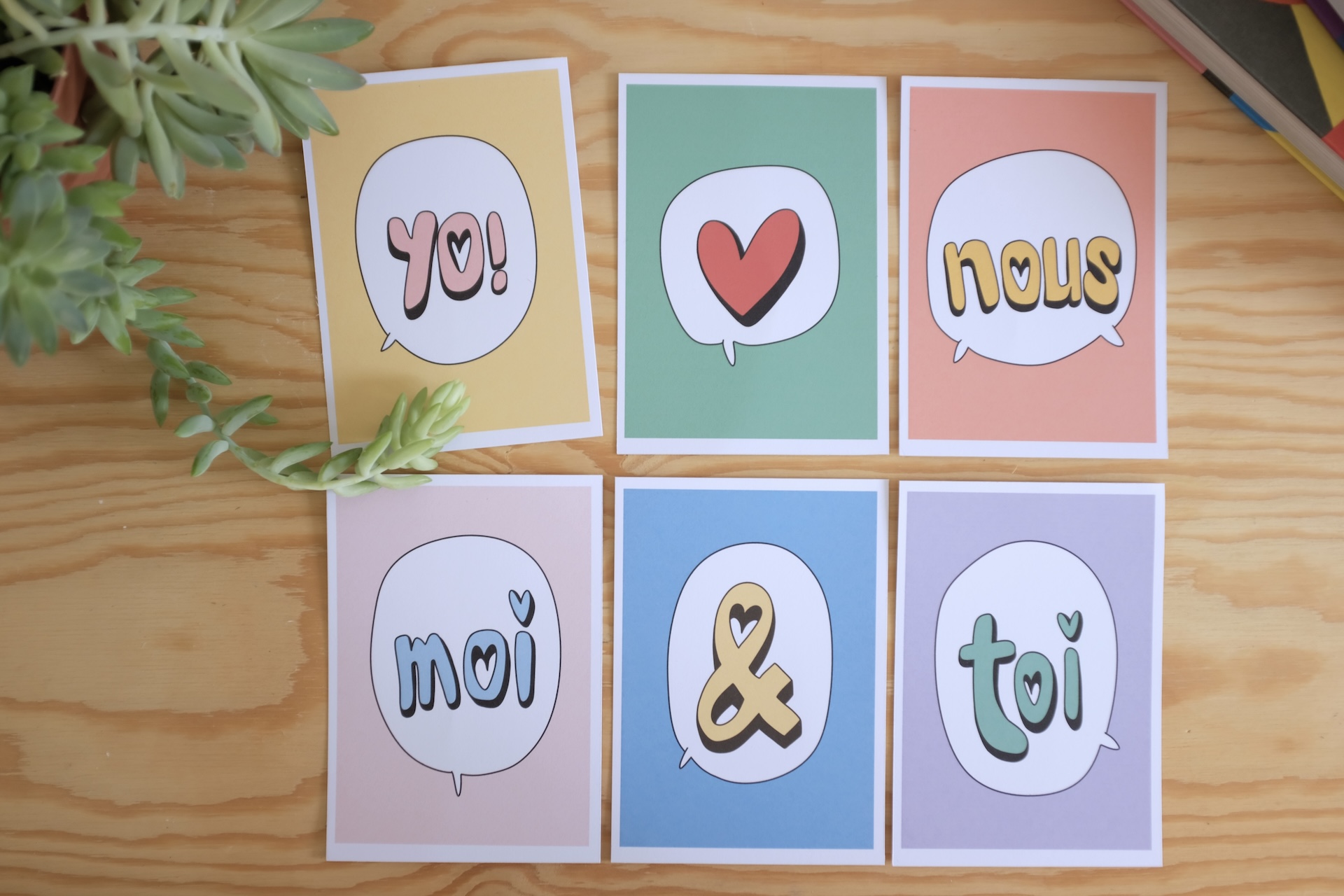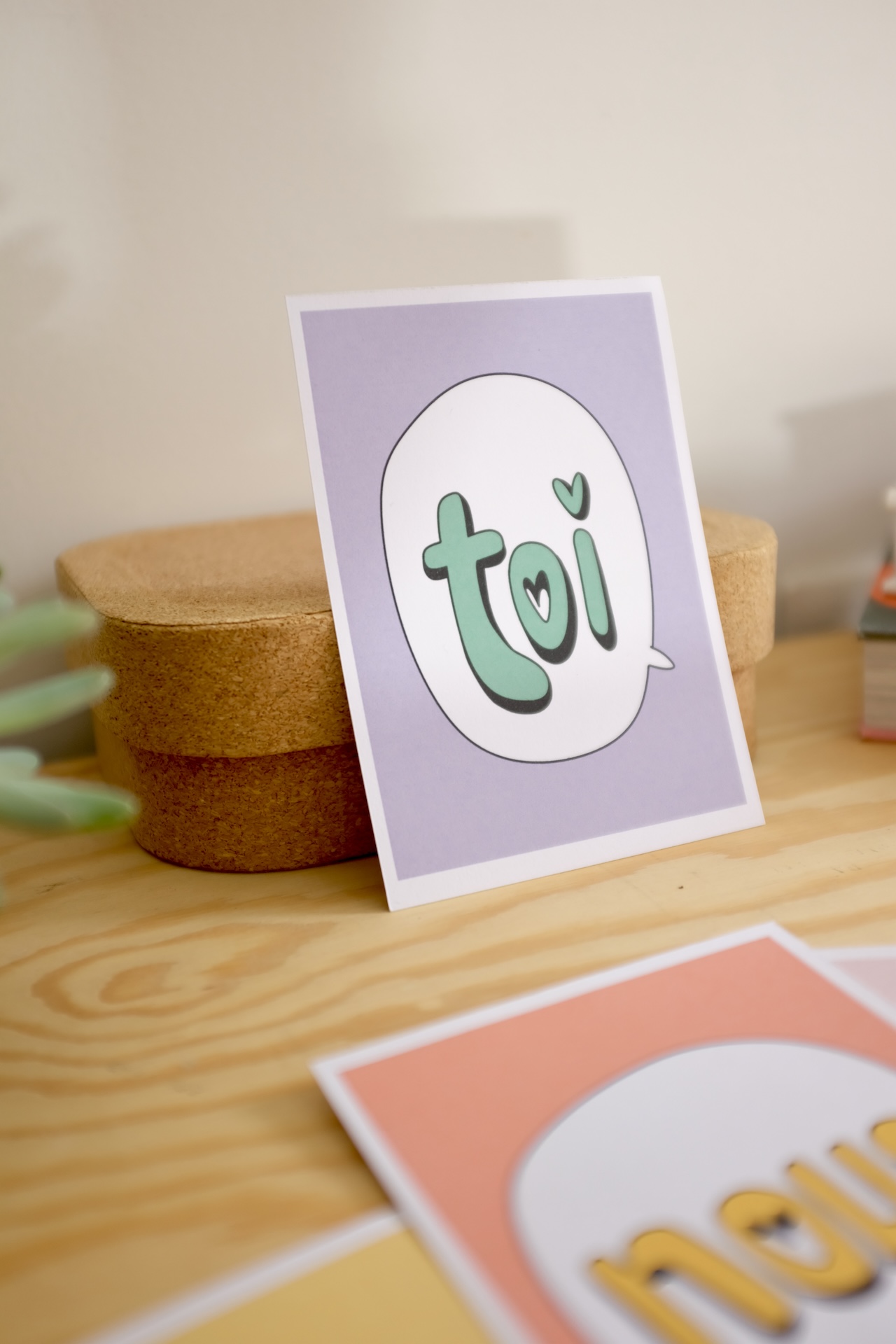 Les cartes « bulles à message » sont directement inspirées de la collab Maison Bâ x Robo Typo. Elles apportent une touche colorée partout où tu les glisses : dans ton courrier, sur ton mur, dans un cadeau… ou juste là où ça te fait plaisir (même dans tes WC, tu as le droit !!)