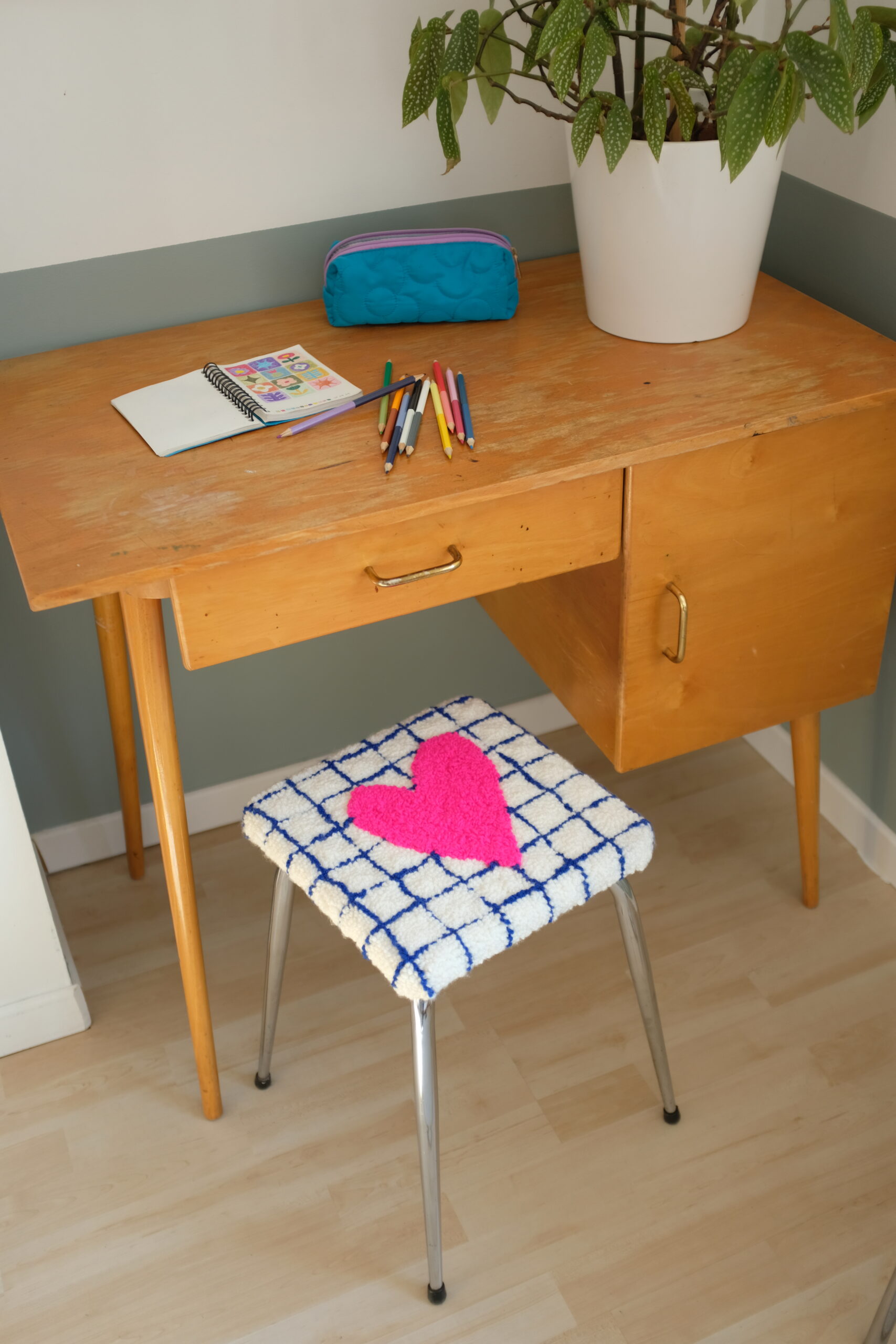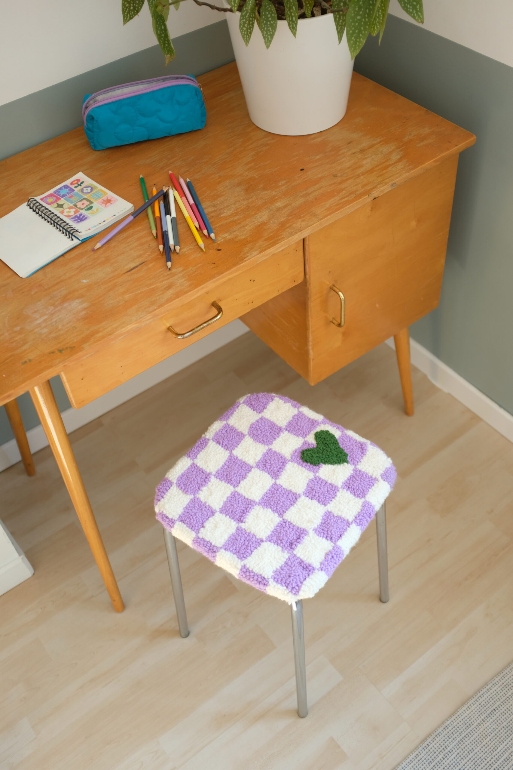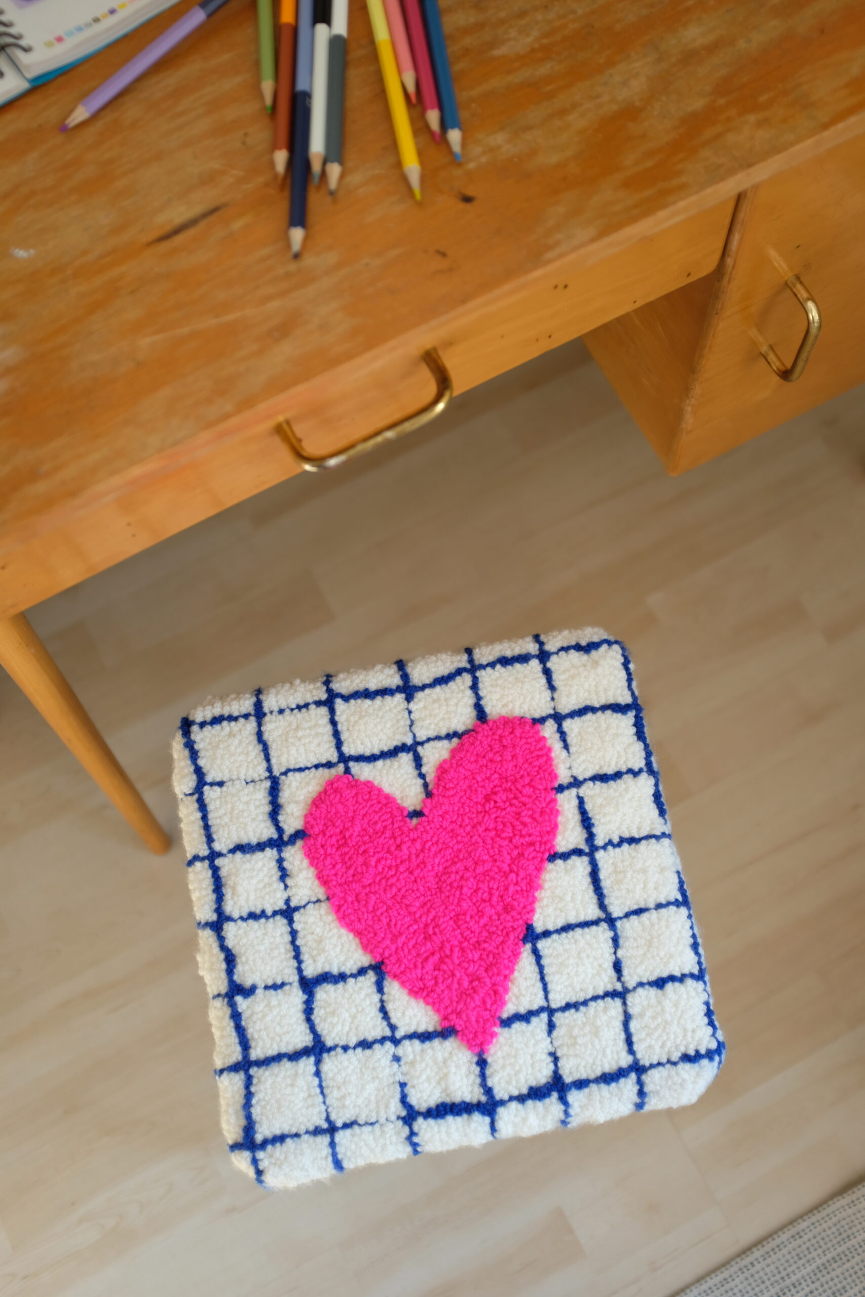 L’assise a été entièrement refaite en contreplaqué (15 mm) puis recouverte d’une toile en punch needle, réalisée à la main à l’aiguille dans mon atelier.