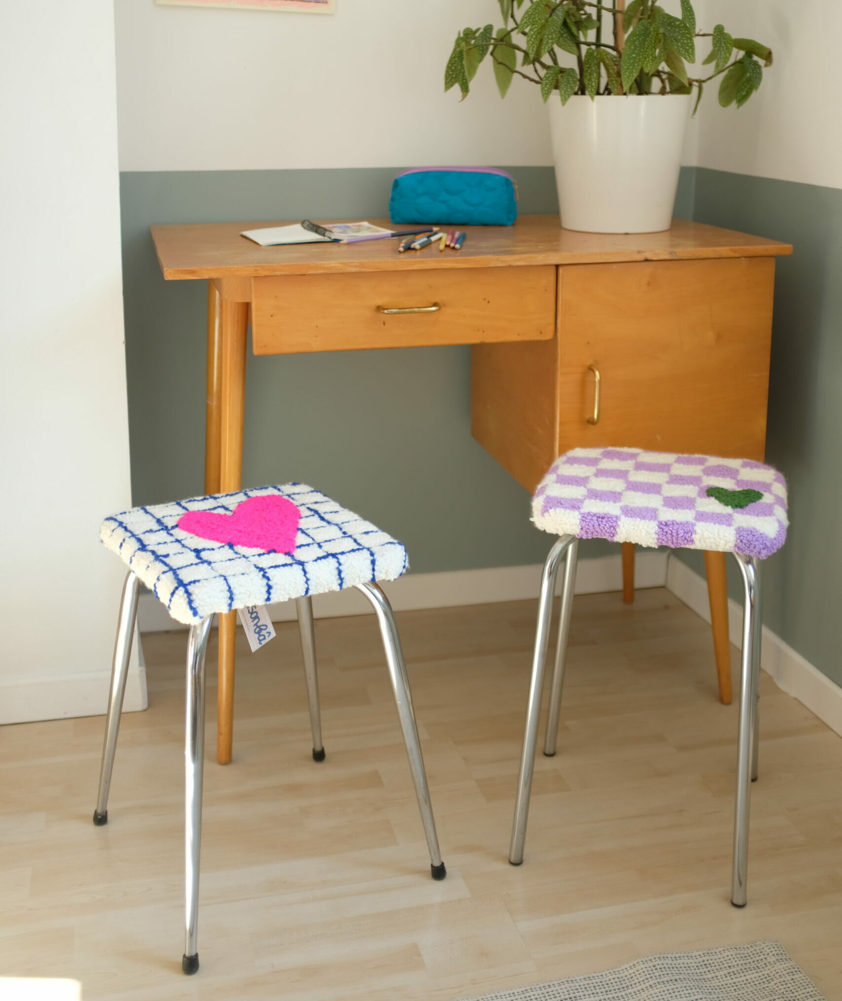 Chaque tabouret est une pièce unique, mêlant artisanat textile et mobilier vintage.
